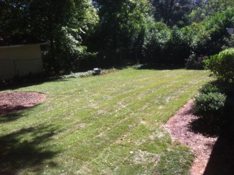 This picture was taken 3 days after the sod was installed on my follow up visit. It is evident and example in some places (in the area of mostly sun) that the fescue has not had enough water. The indicator is when the edges start turning pale/green/grey. Therefore, I recommended to the owner to increase his watering time for 1 hour to cover all areas. I checked back a week later via telephone and he said it has improved with the increased watering. I will be following up on Oct 9th to see if the grass has improved. Understand people, fescue is a sensitive and delicate grass that loves the shade and cool/cold weather. It is more sensitive to direct full sunlight, even in the cooler temperatures. This means you want to make sure you increase your watering times in these full sun areas. All we do is prep the soil, lay the sod , and advise you on how to care for it. We won’t be there everyday to water it and check on it for it unless it is in your budget to pay for follow up visits to water grass. Some of these stressed pieces of sod roll were dry as a bone when I looked on the bottom pieces.