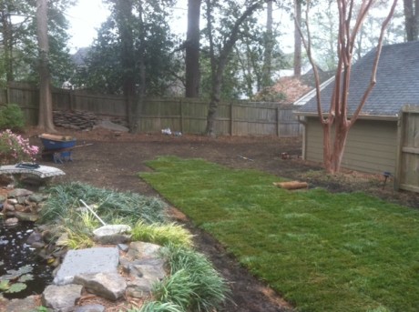 The above 2 pictures are not exactly before pics but in progress. A fresh layer of nutrient rich top soil has been added after all the prep work. Now the fescue sod is being laid.