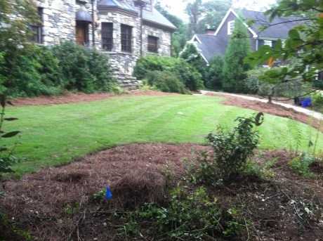Here is an after shot of the emerald zoysia laid, edged, and the beds pine strawed.